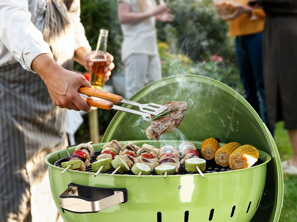 Barbecue portable au charbon de bois avec une grille chromée et un foyer avec couvercle verrouillable. La construction légère et les roulettes permettent de déplacer le barbecue à n'importe quel endroit de la terrasse ou du jardin.
