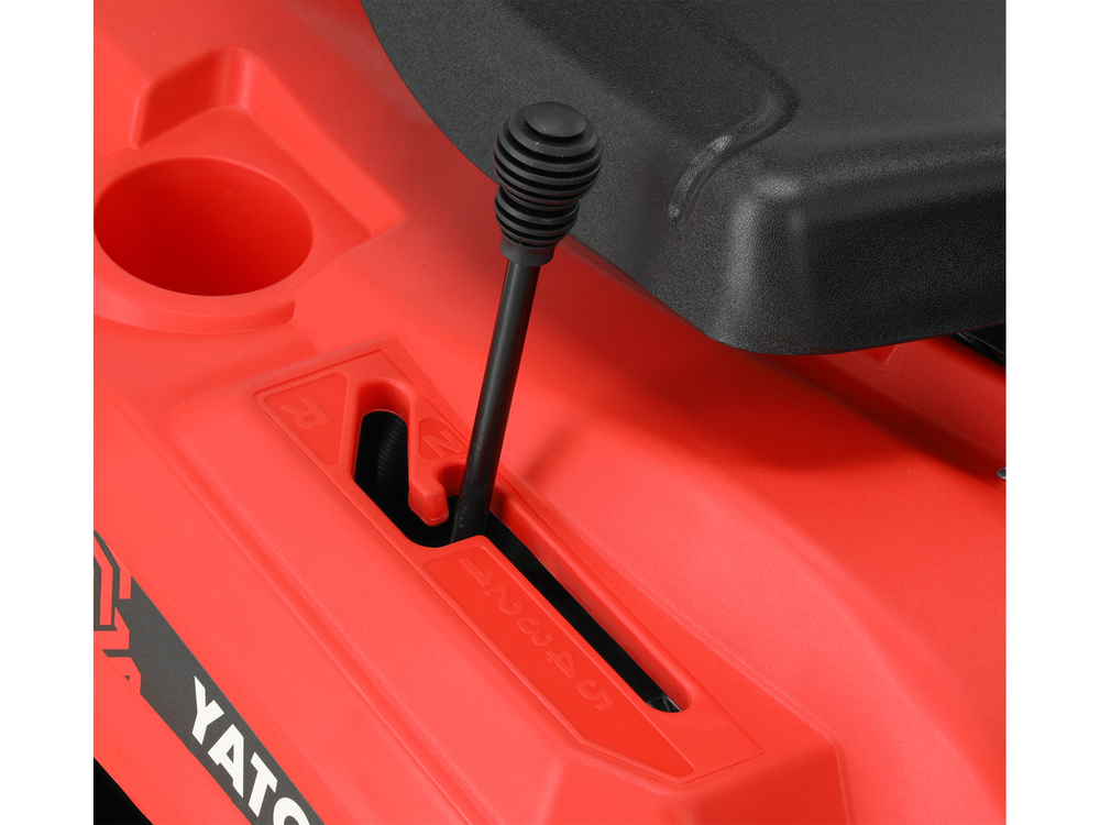 Le tracteur est équipé d'une boîte de vitesses manuelle à 5 rapports. Le plateau de coupe est activé en appuyant simplement sur l'interrupteur situé sous le volant, une nouvelle pression débrayant les lames.