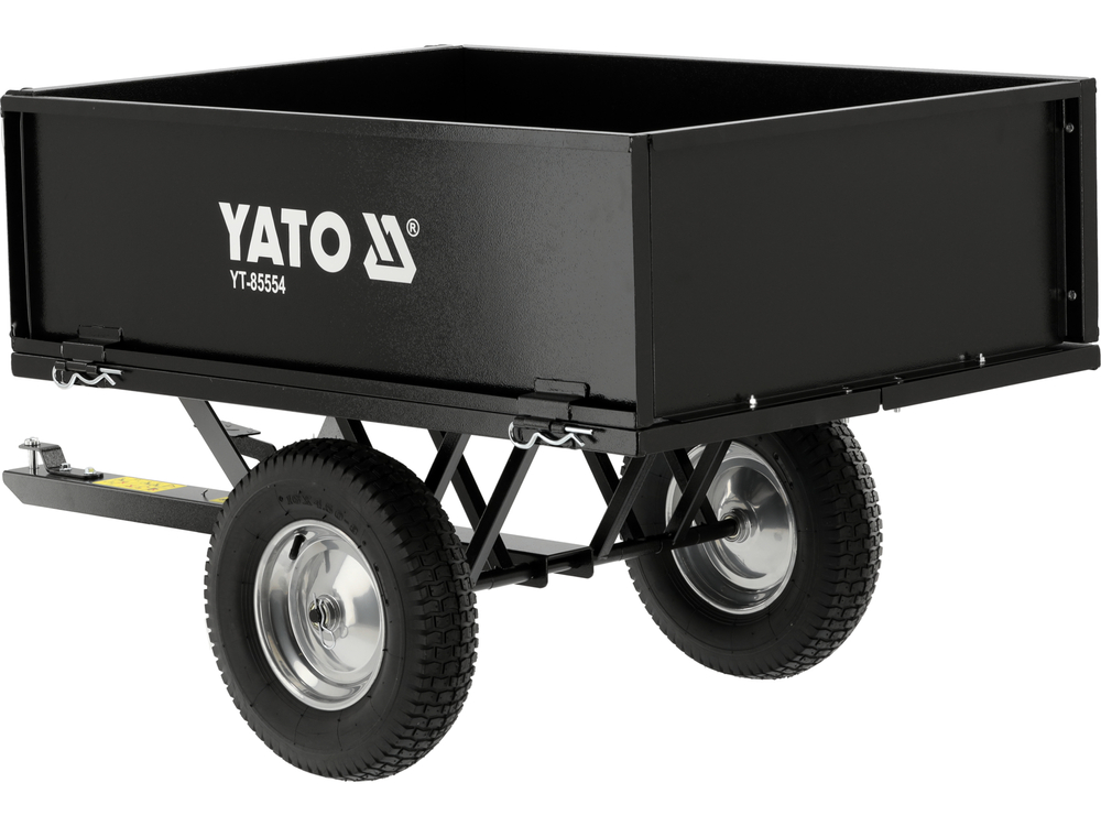 Tracteur remorque de jardin professionnel avec une capacité de charge de 225 kg. Elle dispose d'une fonction de déversement et d'une planche arrière amovible. Elle se fixe à l'arrière du tracteur.