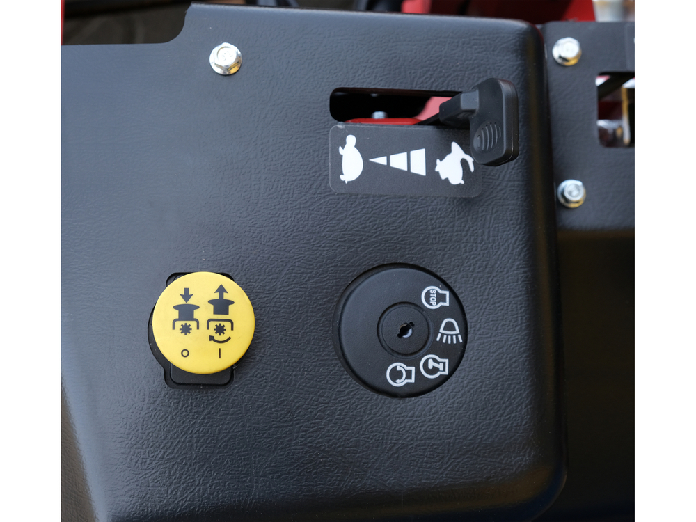 Le tracteur est équipé d'un éjecteur d'herbe à éjection latérale pour un entretien pratique et rapide de la pelouse sans avoir à vider le bac de ramassage. La batterie de 12 V - 12 Ah garantit un fonctionnement durable et les grandes roues robustes (11" à l'avant, 18" à l'arrière) assurent la stabilité et le confort de conduite, même sur les terrains accidentés.