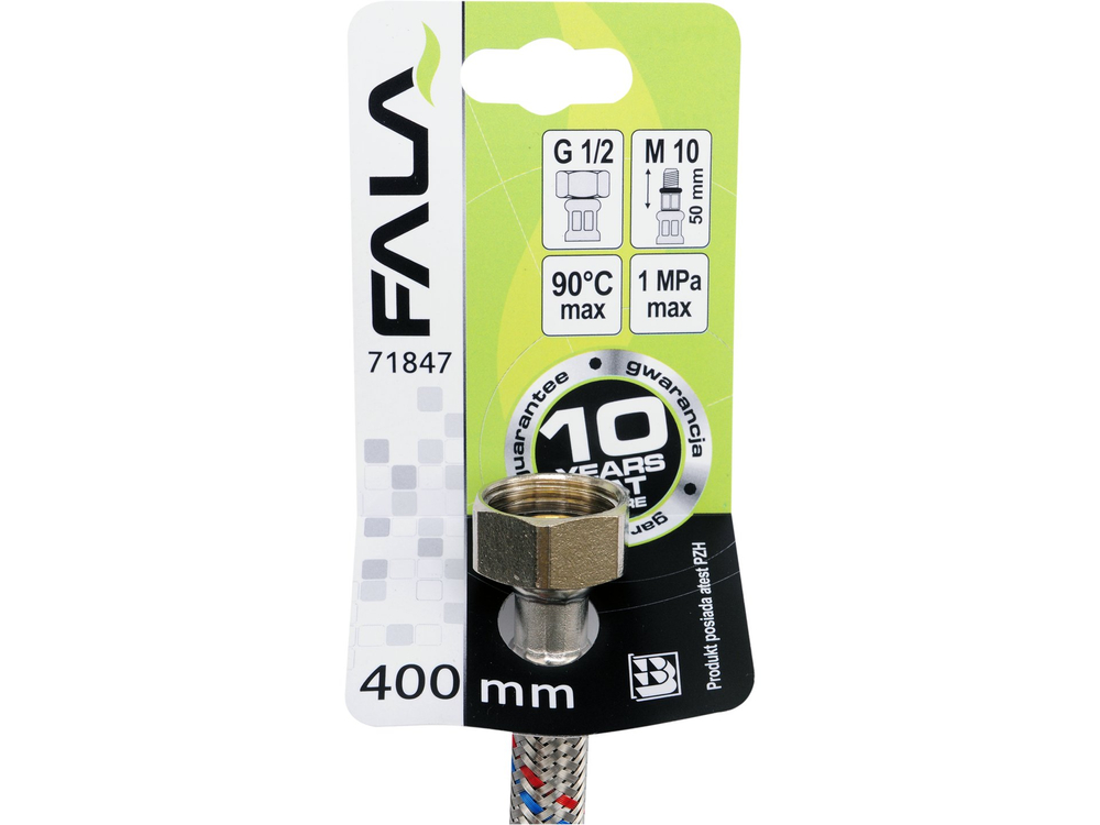 - Elastyczny wąż przyłączeniowy w oplocie ze stali nierdzewnej do baterii. Długość 400mm. Gwint przyłączeniowy: żeński 1/2\" x męski M10 (50mm długi).