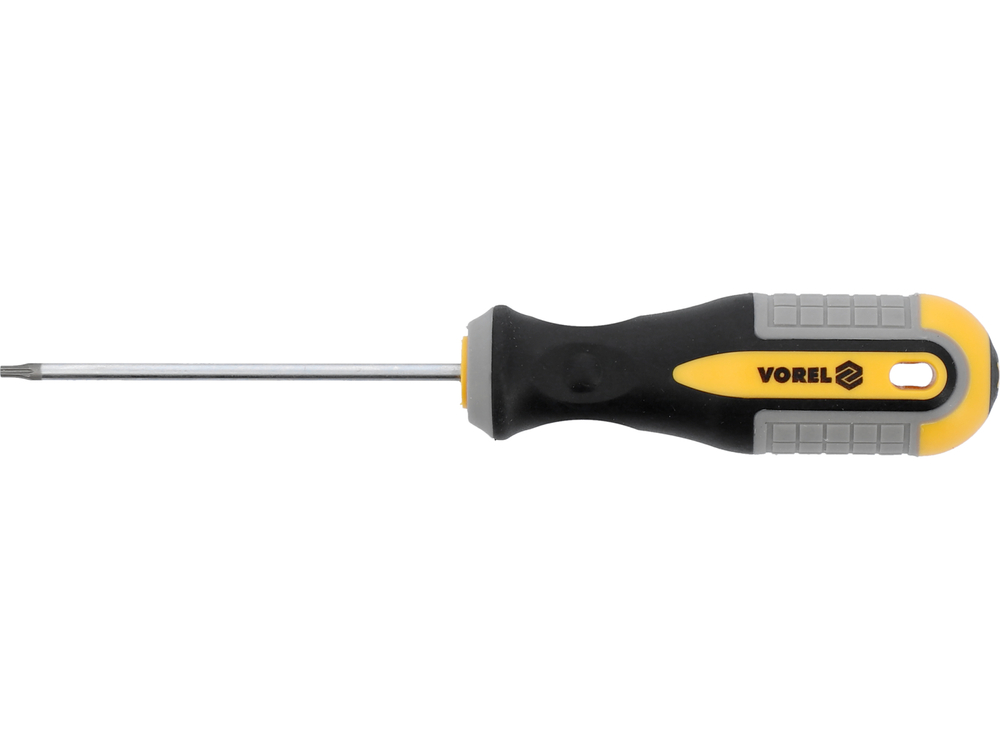 Κατσαβίδι Torx T7 μάρκας Vorel κατασκευασμένο από χάλυβα χρωμίου-βαναδίου CrV. Η λεπίδα έχει σατινέ φινίρισμα, επιπλέον αμμοβολή και μαγνητισμό για ασφαλές κράτημα στην κεφαλή της βίδας. Η λαβή είναι κατασκευασμένη από δι-σύνθετο πλαστικό. Μια οπή στη λαβή επιτρέπει την ανάρτηση του κατσαβιδιού.