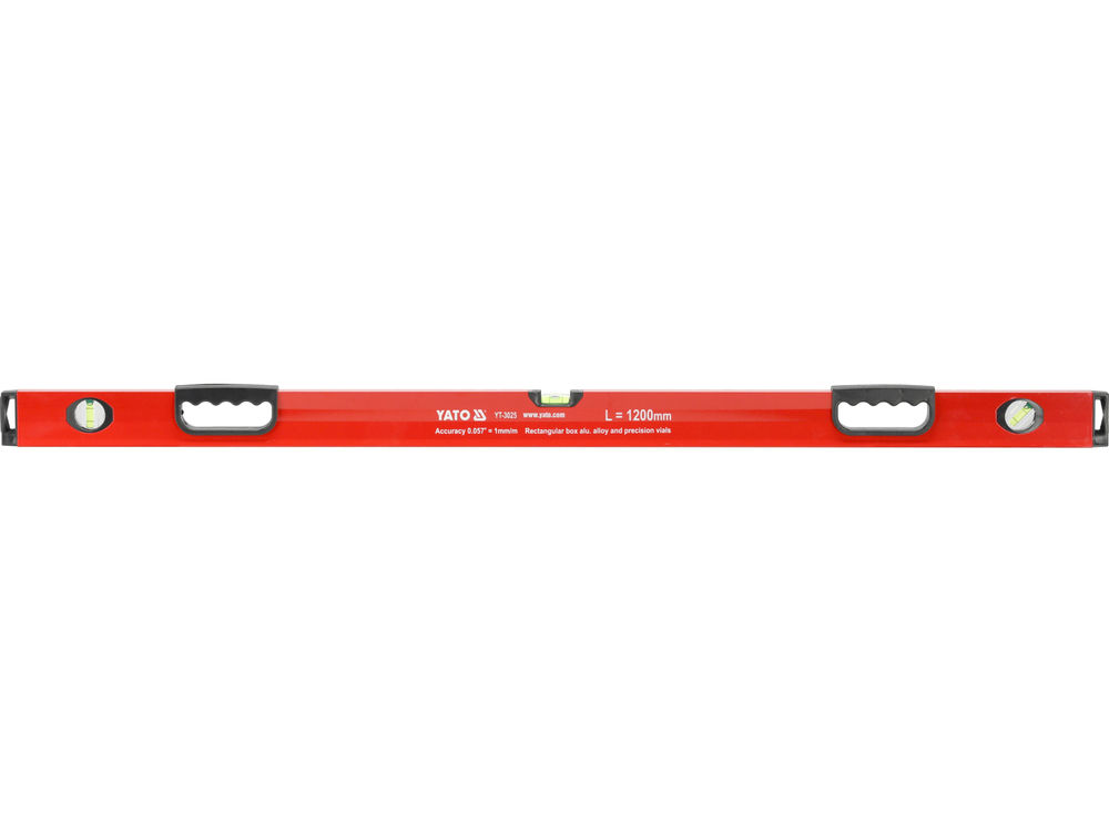 Professzionális építési szint 1200 mm hosszúsággal. Ütésálló test 1,5 mm vastag alumínium profilból. Lakkozott felület. Három, a vízmértéket, a vízszintet és a 45 fokos szöget jelző fiolával rendelkezik.