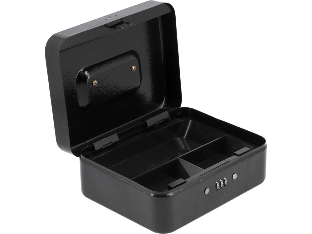 200x160x90mm méretű hordozható pénzes doboz. 0,7 mm vastag acéllemezből készült, feketére festve. Kombinációs zárral zárható. Belül kihúzható érmebetét műanyagból.