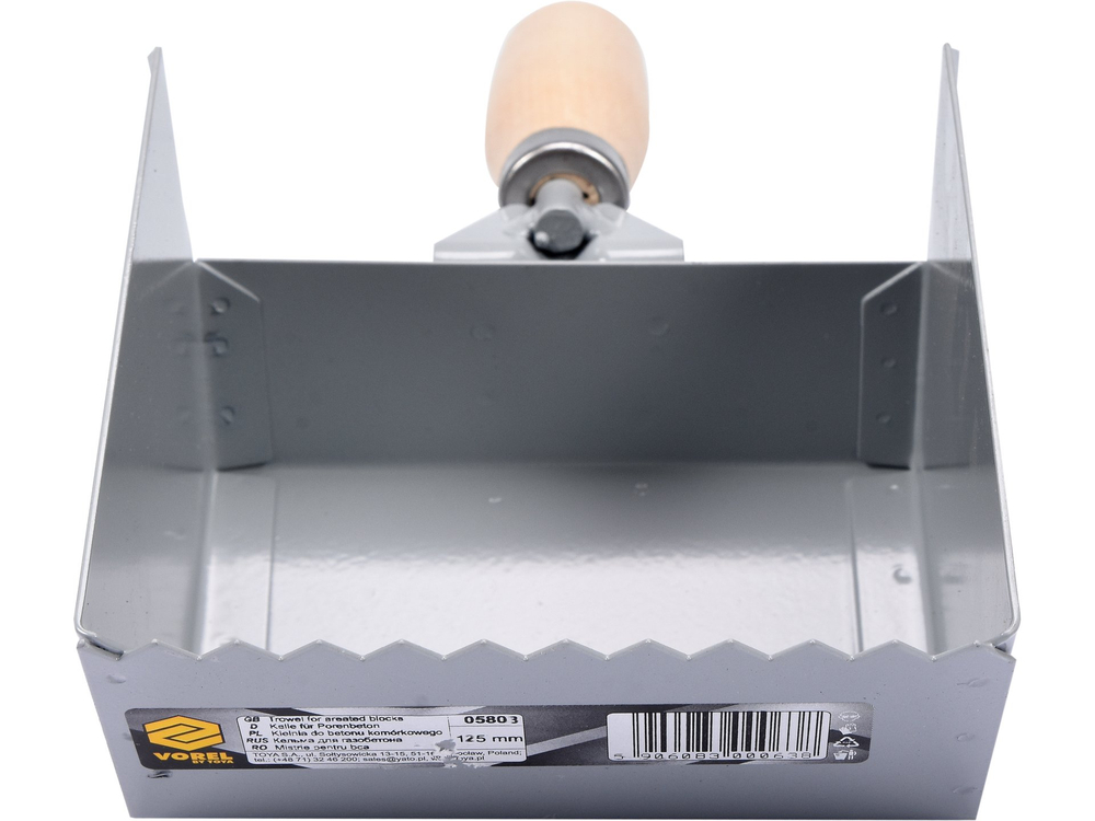 Lakkozott fémlemezből készült 125 mm-es simító. A habarcs felhordására és eloszlatására szolgál a pórusbetonblokkokon. A speciális vödör alakú kialakítás lehetővé teszi a felhasználó számára, hogy a megfelelő mennyiségű habarcsot kanalazzon, a fogakkal ellátott perem pedig lehetővé teszi a keverék egyenletes eloszlását a tömbökön. A simító lapát felakasztható kampóval és kényelmes fa fogantyúval van ellátva.