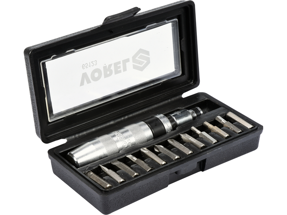 Ütvecsavarhúzó a Vorel 12 bitjével. A bitek és a csavarhúzó robusztus, szerszámminőségű CrV króm-vanádium acélból készültek.