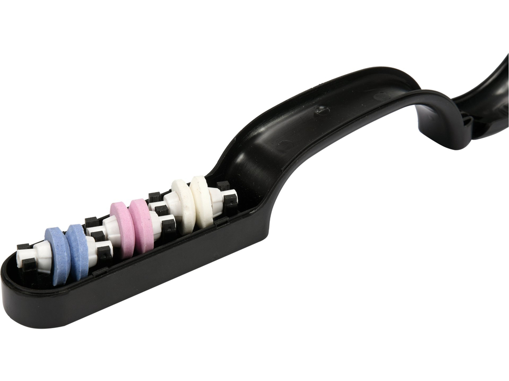 Az élezőtárcsák a rendeltetéstől függően kerámia anyagból, krómkorundból és alumínium-oxidból készülnek. Ez garantálja az optimális előélezési és finomélezési eredményeket. A megfelelő tárcsaszögek, a pengevezető nyílások és a víz használata biztosítja a hatékony és pontos élezést.