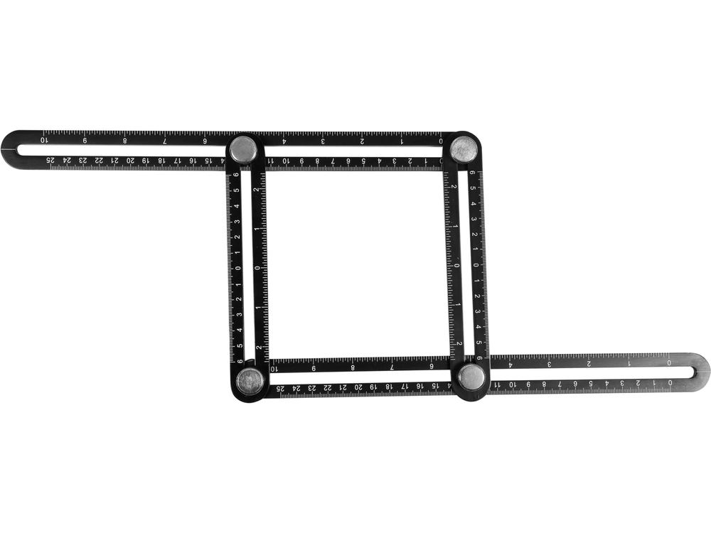 Állítható négyzet a mérések átviteléhez, erős alumínium lapos rudakból. Metrikus és angolszász skálák állandóan jelölve a felületen. Formák ábrázolásához asztalosmunkáknál, csempézésnél, dekorálásnál stb.