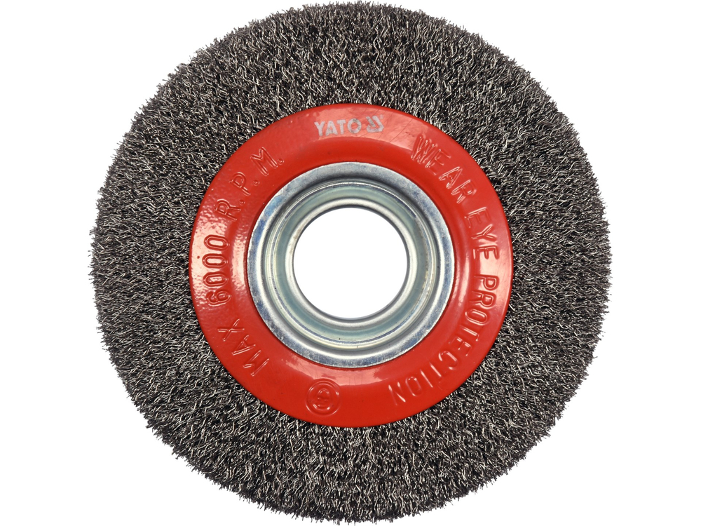 Forgókefe, amelyet fémfelületek, festékbevonatok tisztítására és polírozására, valamint rozsdaeltávolításra és szerszámok tisztítására terveztek, padcsiszolóval.