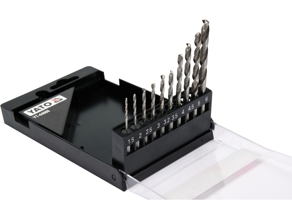 A készlet 10 darab HSS fúrófejet tartalmaz, átmérővel: 1,5, 2,0, 2,5, 3,0, 3,2, 3,5, 4,0, 4,5, 5,0, 6,0 mm, praktikus tokba csomagolva.