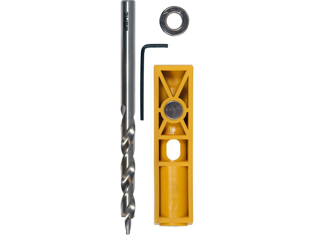 - Tartalmazza: vezetőt a fúrószárhoz való hüvelyes ferde lyukkal, süllyesztett fúrószárat, fúrási mélységütközőt és imbuszkulcsot a fúrószár reteszeléséhez.