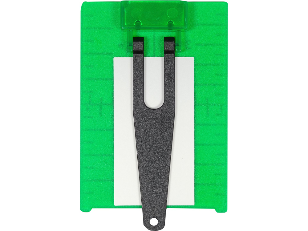Céltábla zöld lézerhez, tiszta metrikus (5 mm-es osztás) és hüvelykes (1/4"-es osztás) beosztással. A hátoldalon tartó és mágnes a céltábla beállításához.