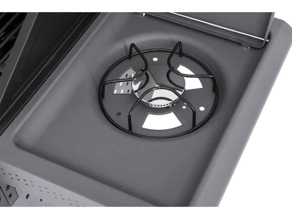 Egyedi, modern megjelenésű YATO Okaya 4+1 gázgrill, 14,2 kW összteljesítménnyel. Felszerelve megbízható 68 x 42 cm-es öntöttvas ráccsal és rozsdamentes acél melegítőráccsal. Az oldalsó polcok és a tágas, zárható szekrény megkönnyítik a fűszerek és a nélkülözhetetlen kiegészítők tárolását. A 2,2 kW-os oldalsó égő lehetővé teszi az ételek főzését és melegítését egy edényben vagy serpenyőben. További jellemzői közé tartozik a gázpalack számára kialakított hely és a fedélen lévő üvegablak.