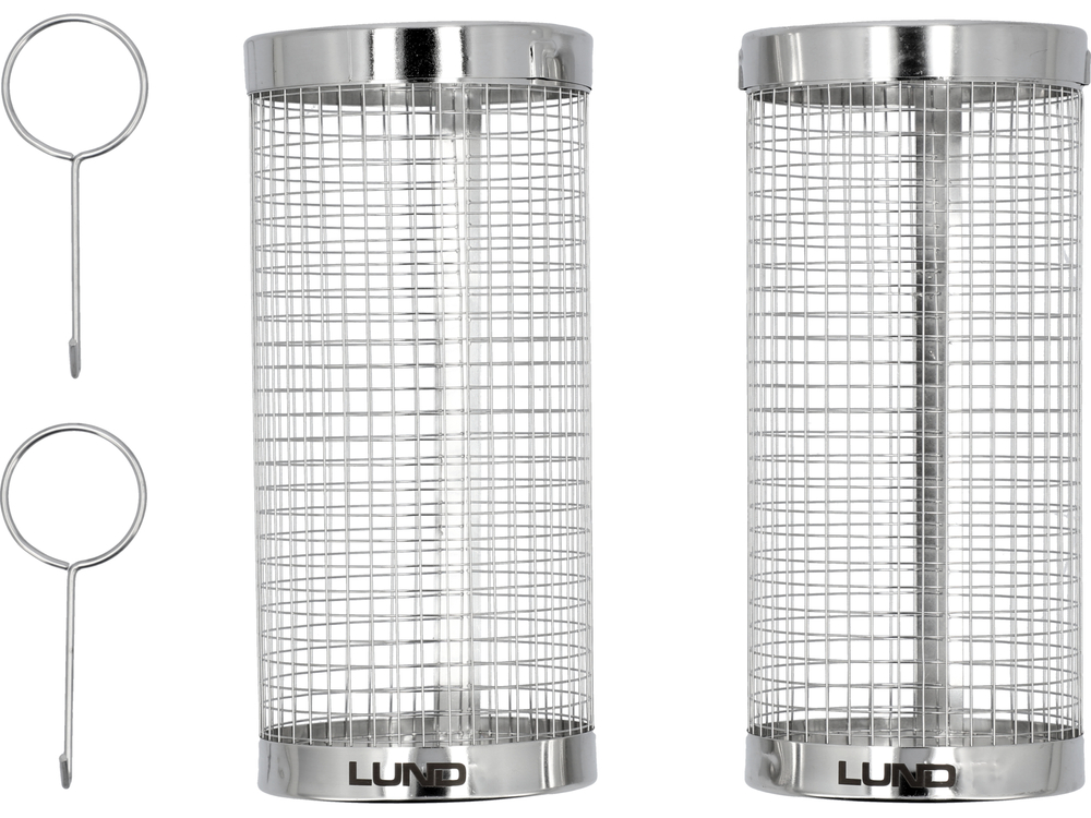 2 acél grillkosár z zárható henger alakban. Kiválóan alkalmasak apró összetevők, adagolt hús- vagy zöldségdarabok sütésére.