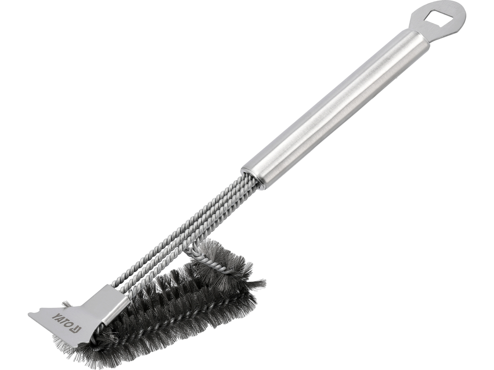Rozsdamentes acél grillkefe kaparóval és sörnyitóval. Lehetővé teszi a megégett ételmaradékok, zsír, szén eltávolítását a grillrácsokról, a grill felületéről, a tálakról, a hamutálcákról és a füstölő kamrákról.