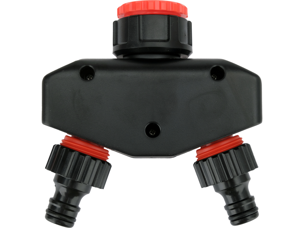 Szilárd elosztó csapcsatlakozóval, két kimenettel felszerelve. Lehetővé teszi két független vízvezeték egyszerre történő csatlakoztatását egy 3/4" vagy 1" menetes csapra. A tartós ABS és POM anyagokból készült, megbízható működést és ellenállást biztosít az időjárási viszonyok és mechanikai sérülések ellen.