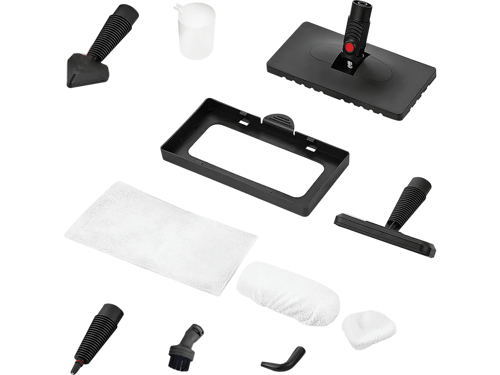 gőzfelmosó, víztartály (mérőpohár), fej mikroszálas talppal, mikroszálas párna x3, széles fúvóka padlókhoz, háromszögletű sarokbit, keskeny hegy üveghez és tükörhöz,