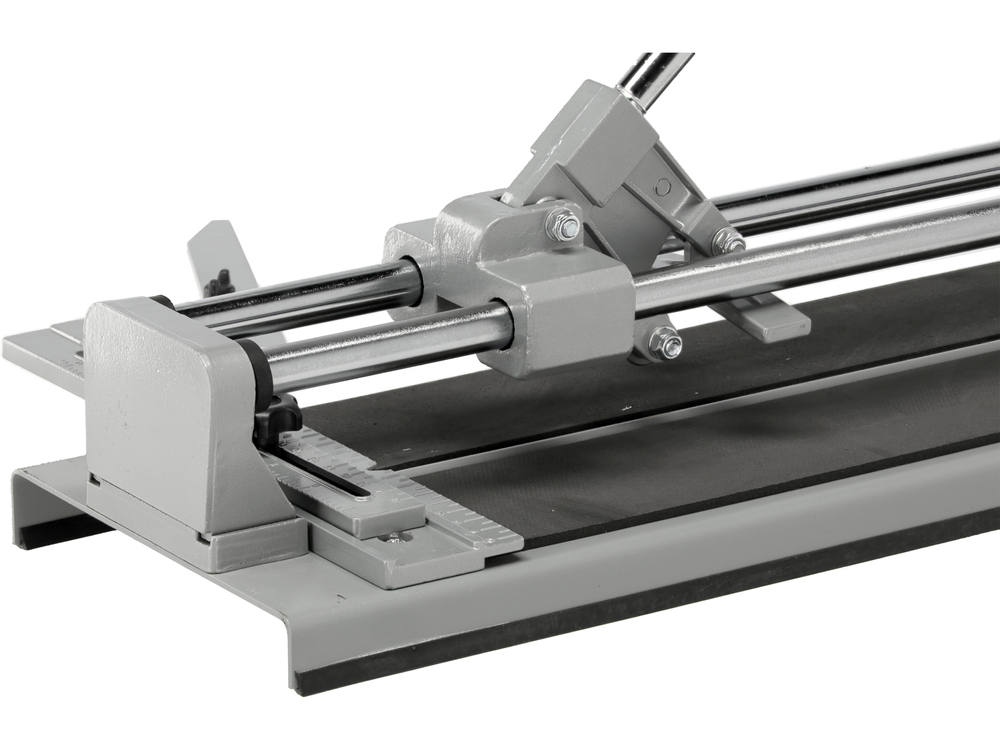 Dispositivo di taglio per piastrelle di altissima qualità con una lunghezza massima di taglio di 590 mm. La dima di taglio è costituita da una base molto robusta in lamiera d'acciaio con uno strato di microgomma tecnica, da due guide tubolari parallele e da un'unità di taglio con cuscinetto, un rompitratta e una ruota da taglio in metallo duro con un diametro di 22 mm.