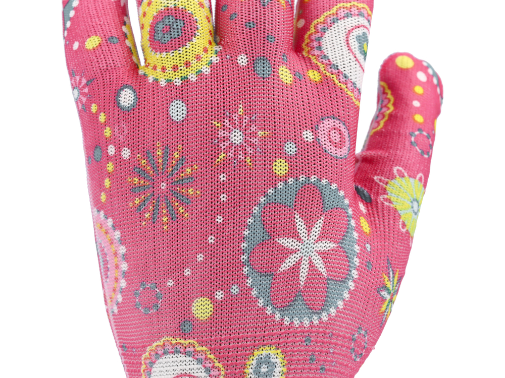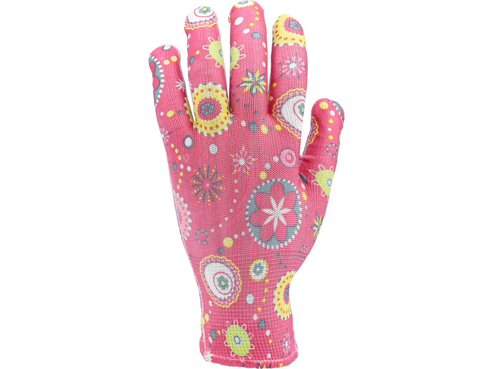 Guanti da giardino leggeri in poliestere rosa con motivi colorati. La struttura senza cuciture garantisce un elevato comfort e un'eccellente sensibilità all'oggetto da impugnare.