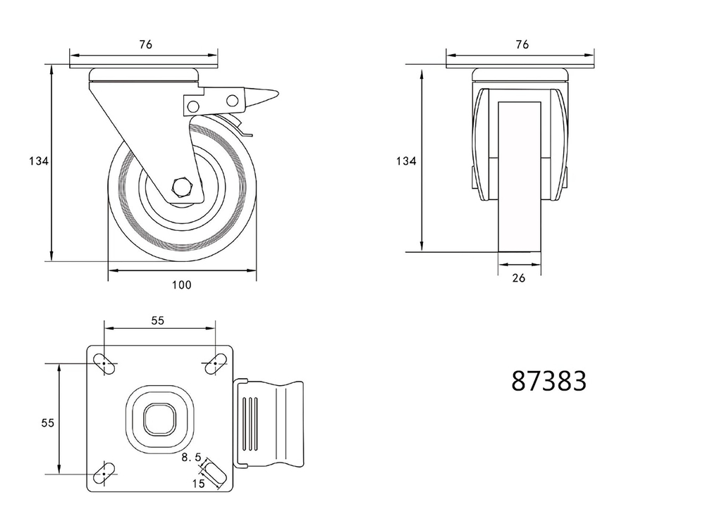 - Koło skrętne średnica 100 mm, łożyskowane, z hamulcem i płytką do mocowania.