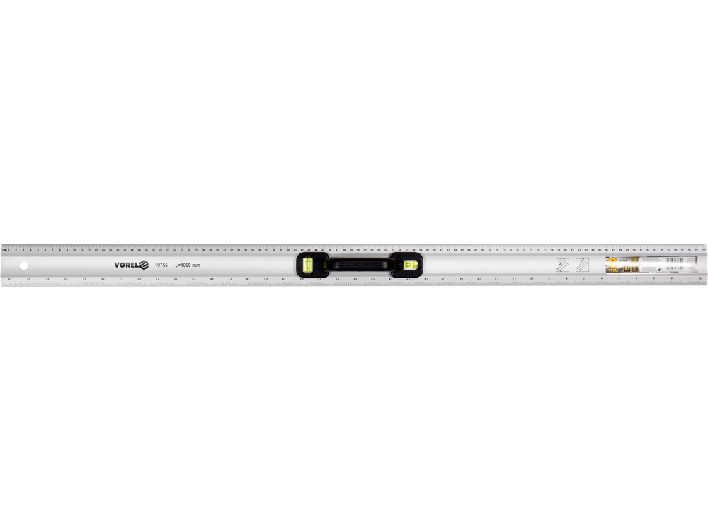 Righello in alluminio lungo 1000 mm con impugnatura e due fiale. Marcato con graduazioni in millimetri e pollici.