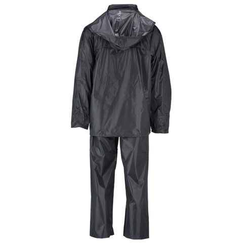 Set impermeabile in due pezzi di Vorel. Giacca con due ampie tasche e cappuccio regolabile, pantaloni con elastico in vita e con spacchi laterali attraverso i quali si accede alle tasche dei pantaloni.