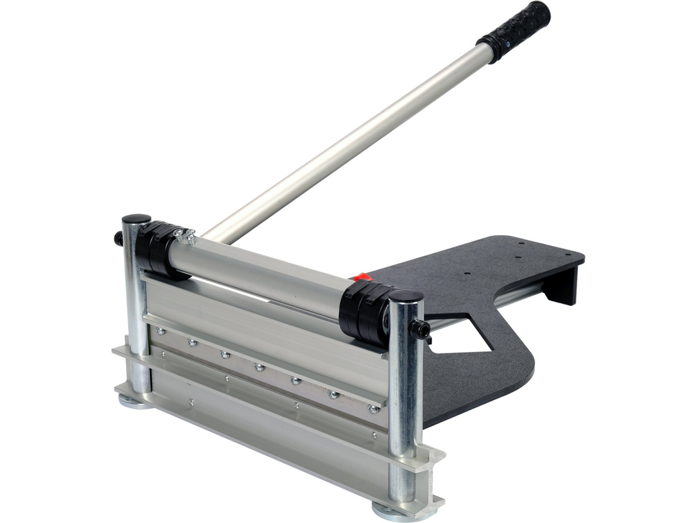 Ghigliottina per il taglio di pannelli per pavimenti, larghezza di taglio 340 mm, spessore massimo del materiale da tagliare 16 mm. La lama della ghigliottina è inserita in profili di alluminio montati su piedistalli verticali in acciaio. Il braccio di bloccaggio è lungo circa 600 mm, la superficie di lavoro è in plastica dura e resistente all'usura e ha dimensioni di 370 mm x 600 mm. Si noti che la lama a ghigliottina è estremamente affilata e che è necessario prestare attenzione quando si lavora con essa. La ghigliottina può essere utilizzata per tagliare pannelli per pavimenti e materiali di finitura simili fino a uno spessore di circa 16 mm. Posizionare il materiale da tagliare sul piano di lavoro tra gli zoccoli di bloccaggio della lama a ghigliottina, quindi premere con cautela la leva per abbassare la lama sul materiale e tagliare la sezione desiderata esercitando pressione. A causa dell'eccezionale affilatura della lama, è necessario prestare particolare attenzione durante il funzionamento.