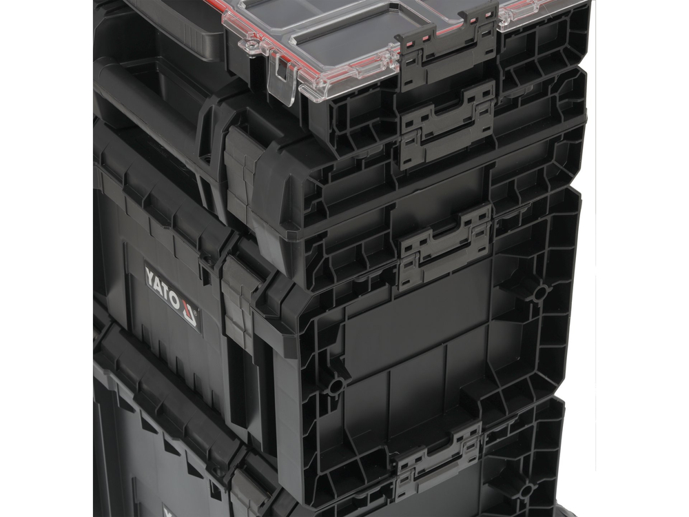 L'insieme è un set mobile in 4 parti su ruote con manico telescopico, dotato di grandi ruote rivestite in gomma e montate su un asse metallico. Inoltre, robuste chiusure e connettori laterali in poliammide resistente garantiscono la sicurezza degli utensili trasportati. Le guarnizioni flessibili inserite nei coperchi assicurano una tenuta a prova di spruzzi, che protegge il contenuto da spruzzi e polvere.