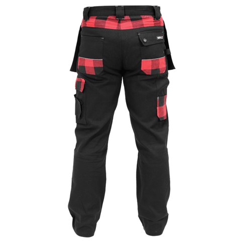 Il materiale di flanella rosso e nero sulle tasche ha una funzione decorativa, mentre sul retro, sotto la cintura, migliora il comfort, la vestibilità e le proprietà termiche di questa parte del corpo.