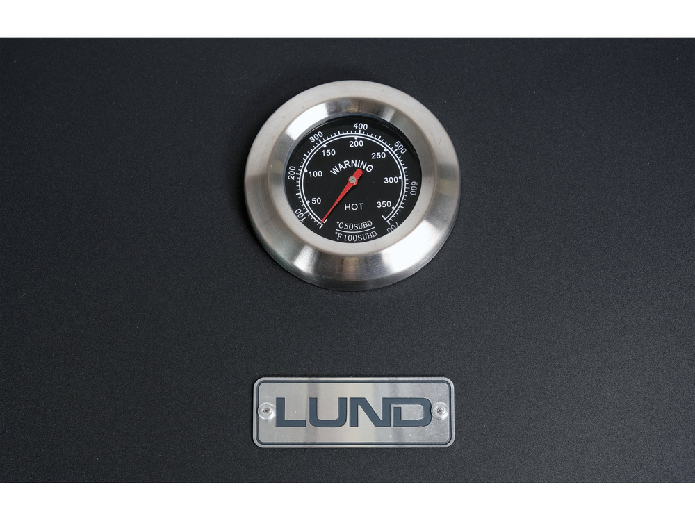 • coperchio smaltato con maniglia in acciaio inox per mantenere e controllare la temperatura. Quando è chiuso, mantiene il sapore affumicato e l'aroma dei cibi, mentre quando è aperto protegge dal vento.