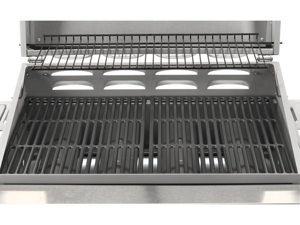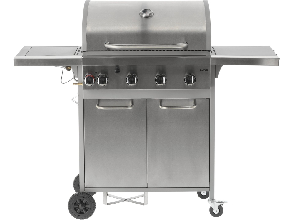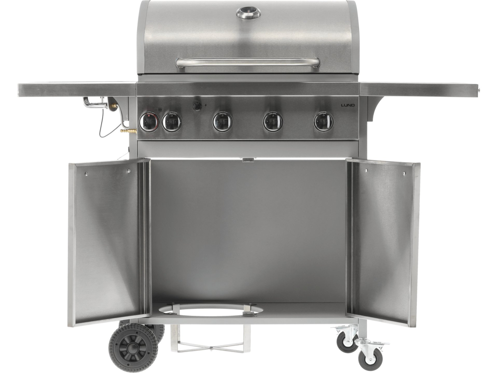 Un grill a gas 3+1 realizzato in acciaio inox e dotato di una griglia in ghisa. I ripiani laterali e l'ampio armadietto con serratura consentono di riporre facilmente gli accessori necessari. Il bruciatore laterale da 3,2 kW consente di cuocere e riscaldare i cibi in pentola o in padella. Tra le caratteristiche aggiuntive figurano lo spazio per una bombola di gas da 11 kg, una piastra di sgocciolamento estraibile e un apribottiglie integrato.