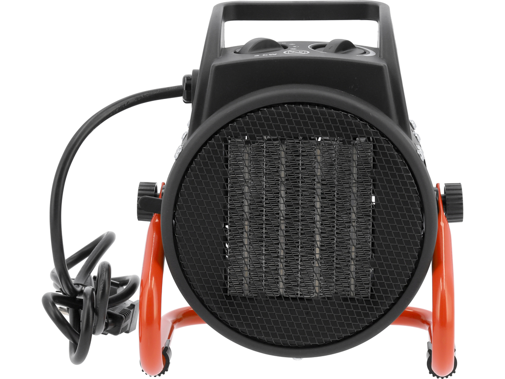 Riscaldatore elettrico PTC portatile in un involucro metallico. È utilizzato per riscaldare stanze, laboratori, sale e per asciugare durante i lavori di riparazione e costruzione. L'utente può impostare tre modalità di funzionamento del dispositivo: funzionamento della sola ventola senza il riscaldatore, funzionamento del riscaldatore a metà potenza e funzionamento a piena potenza. L'involucro è verniciato a polvere e protegge il riscaldatore dalla ruggine. Il riscaldatore è dotato di una doppia protezione contro il surriscaldamento.