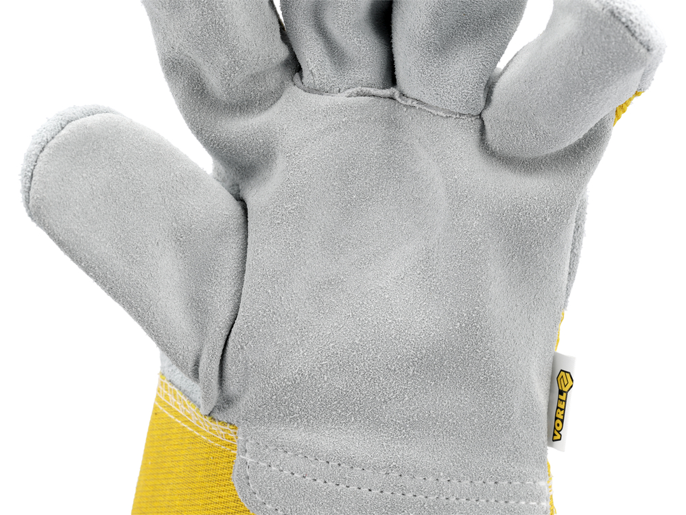 Robusti guanti da costruzione realizzati in spessa pelle bovina e maglia di cotone. Si riveleranno particolarmente utili durante i lavori di costruzione pesanti, in giardino e ovunque non sia richiesto un alto livello di precisione nella presa.
