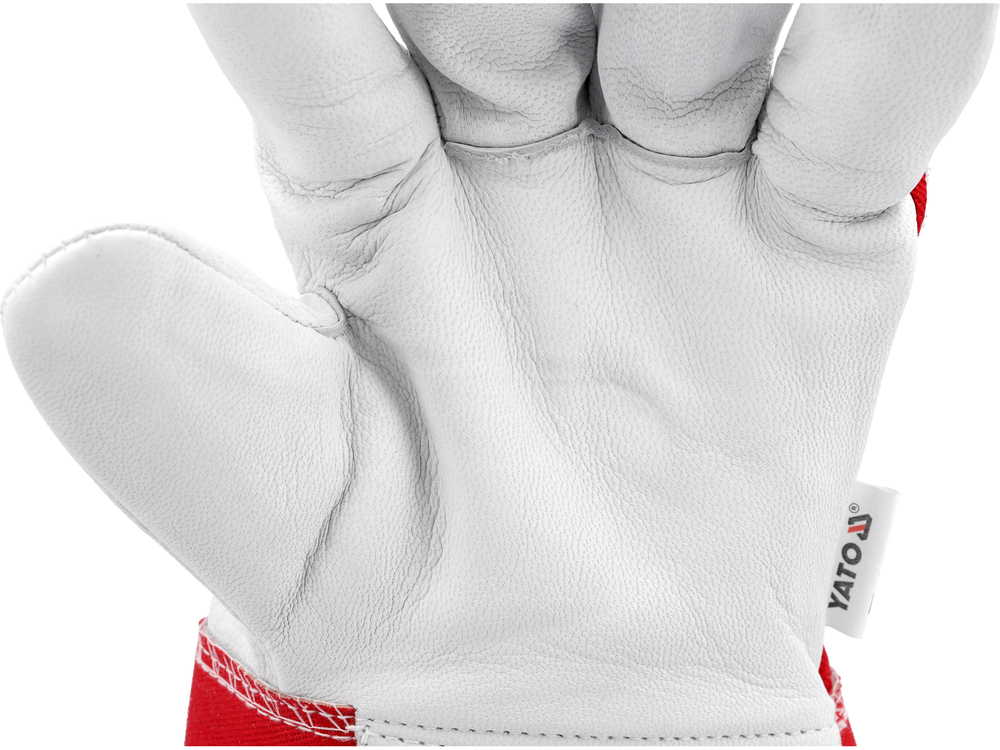 Guanti da costruzione in pelle naturale e tessuto a maglia di cotone di colore rosso. La pelle di capra di alta qualità rende i guanti molto piacevoli al tatto e previene l'eccessiva sudorazione. Si dimostreranno validi soprattutto nei lavori di costruzione pesanti, in giardino e ovunque non sia richiesta una presa di alta precisione.