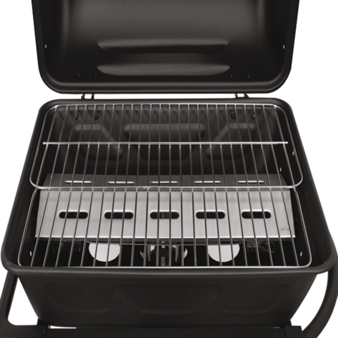 Grill a gas con due bruciatori per cucinare all'aperto, con comodi comandi per una cottura perfetta dei cibi. Le dimensioni compatte consentono di riporre facilmente il grill in spazi ridotti.