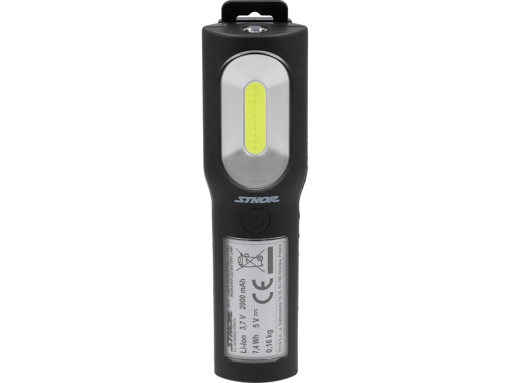 Una lampada da officina leggera e portatile con quattro modalità di funzionamento, che consentono di adattare la luce all'attività da svolgere e al livello della batteria. Una clip, un magnete e un gancio per appendere la lampada sono un ulteriore vantaggio.