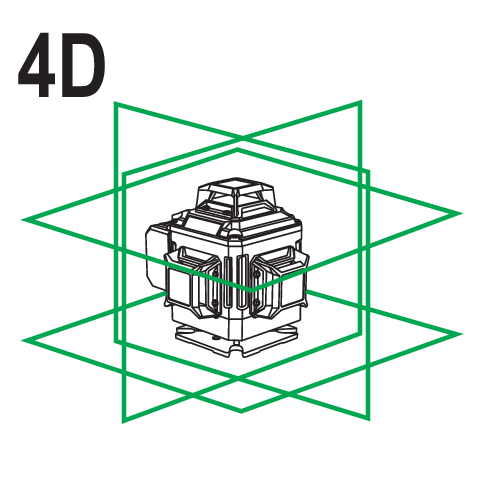Laser autolivellante 4D a quattro piani con raggio verde. Produce 16 linee, quattro per piano. Permette di ottenere in tempo reale l'orizzontale e la verticale su qualsiasi parete. Il diodo laser garantisce una visibilità interna fino a 25 metri.