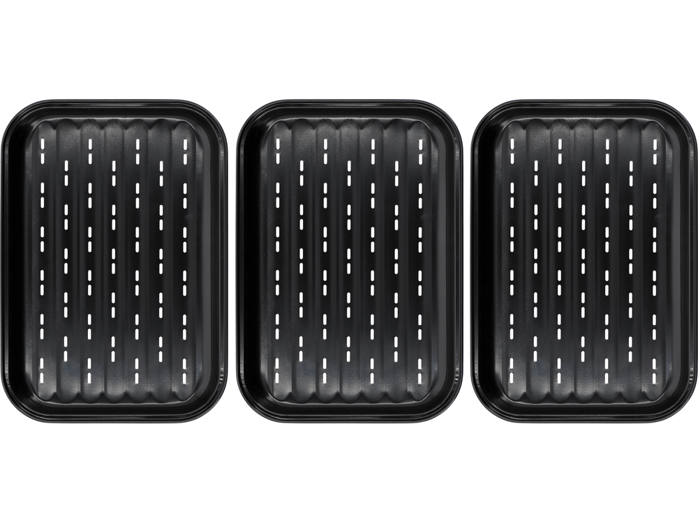 Trzy vassoi da griglia in acciaio scanalato con rivestimento antiaderente. A differenza dei vassoi monouso in alluminio, la padella da griglia con rivestimento antiaderente è riutilizzabile e non rilascia sostanze dannose a temperature elevate. È un'alternativa più sana ed ecologica che consente di gustare piatti alla griglia senza compromessi.