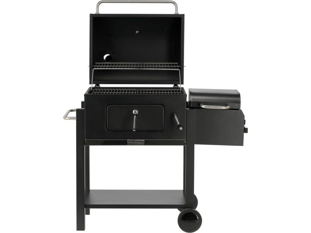 Il funzionale barbecue portatile a carbonella con affumicatore consente di preparare vari tipi di cibo all'aperto. Realizzato in acciaio di alta qualità verniciato a polvere nera, mantiene la sua resistenza agli agenti atmosferici e alla corrosione per un lungo periodo di utilizzo intensivo.