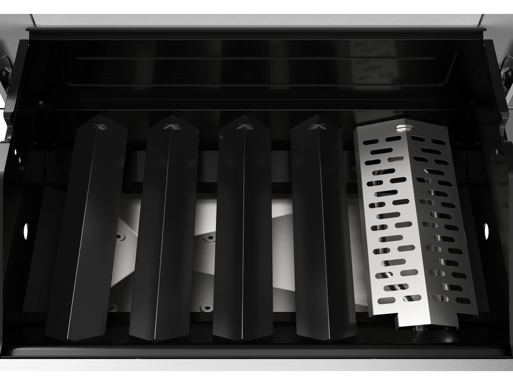 - bruciatore laterale a infrarossi da 3,5 kW che raggiunge una temperatura estremamente alta di 800 gradi, consentendo di rosolare rapidamente (il cosiddetto "sear") e cuocere bistecche (non consigliato per l'uso come bruciatore per riscaldare pentole, padelle, ecc.)