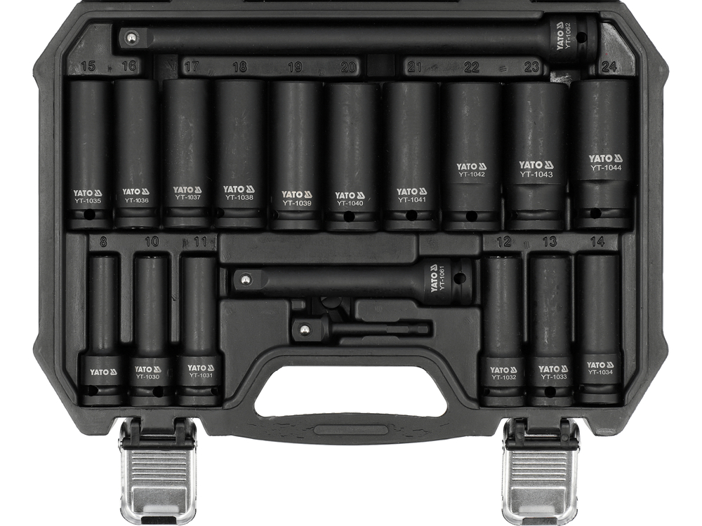 - 16 bussole esagonali 1/2" nei seguenti formati: 8, 10, 11, 12, 13, 14, 15, 16, 17, 18, 19, 20, 21, 22, 23, 24 mm