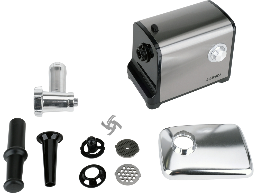 - nella confezione: vassoio, lama, 3 dischi per la macinatura (di diametro 3 mm, 5 mm, 7 mm), accessorio per riempire le salsicce, 2 accessori per kebbe e pusher