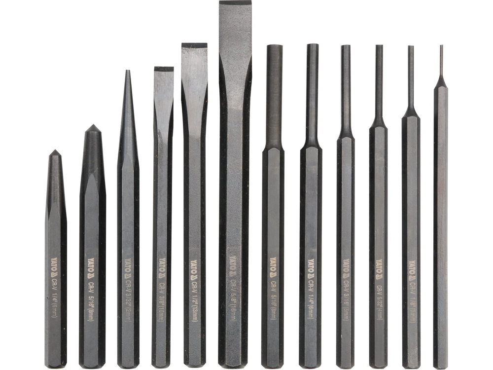 Komplektā ietilpst cilindriskie urbji 1,5 , 3 , 4 , 5 , 6 , 8 mm, konusveida urbji 2 mm, kalti 10, 13, 16 mm, perforatori 6 mm un 8 mm. Garumi no 100 līdz 150 mm. Instrumenti izgatavoti no sešstūraina CrV 6150 tērauda stieņa, ar melnētu virsmu. Iepakoti plastmasas traukā.