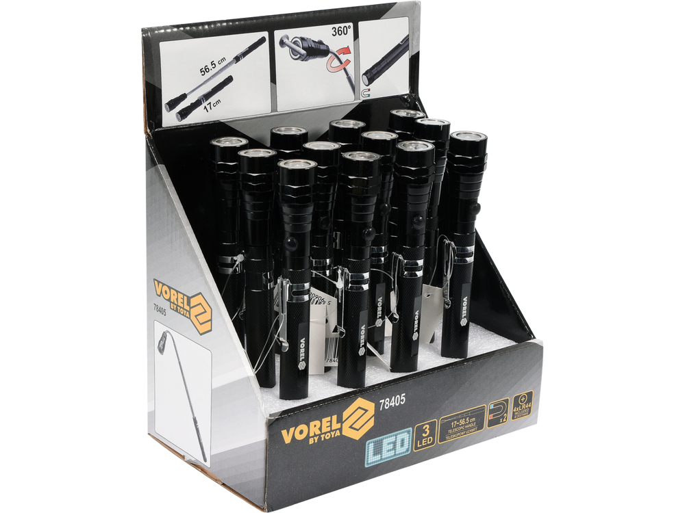 78405 ir alumīnija teleskopiskais satvērējs ar magnēta un lukturīša funkciju, kas noder darbnīcā vai garāžā. Teleskopiskā roka ar maksimālo garumu 56,5 cm beidzas ar galviņu ar magnētu, lai paceltu metāla priekšmetus, piemēram, skrūves, uzgriežņus, paplāksnes utt., no grūti aizsniedzamām vietām. Galva ir aprīkota ar trim LED diodēm, kas apgaismo darba zonu un atvieglo meklēto priekšmetu atrašanu. Galviņa ir uzstādīta uz elastīga 360 grādos grozāma kakla, un satvērējam ir arī papildu magnēts pamatnē, kas ļauj to piestiprināt pie metāla virsmām un izgaismot darba vietu. Kompaktais izmērs salocītā veidā(17 cm) un metāla skava ļauj to ērti nēsāt kabatā.
