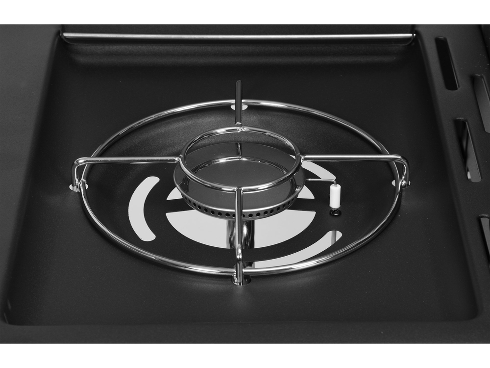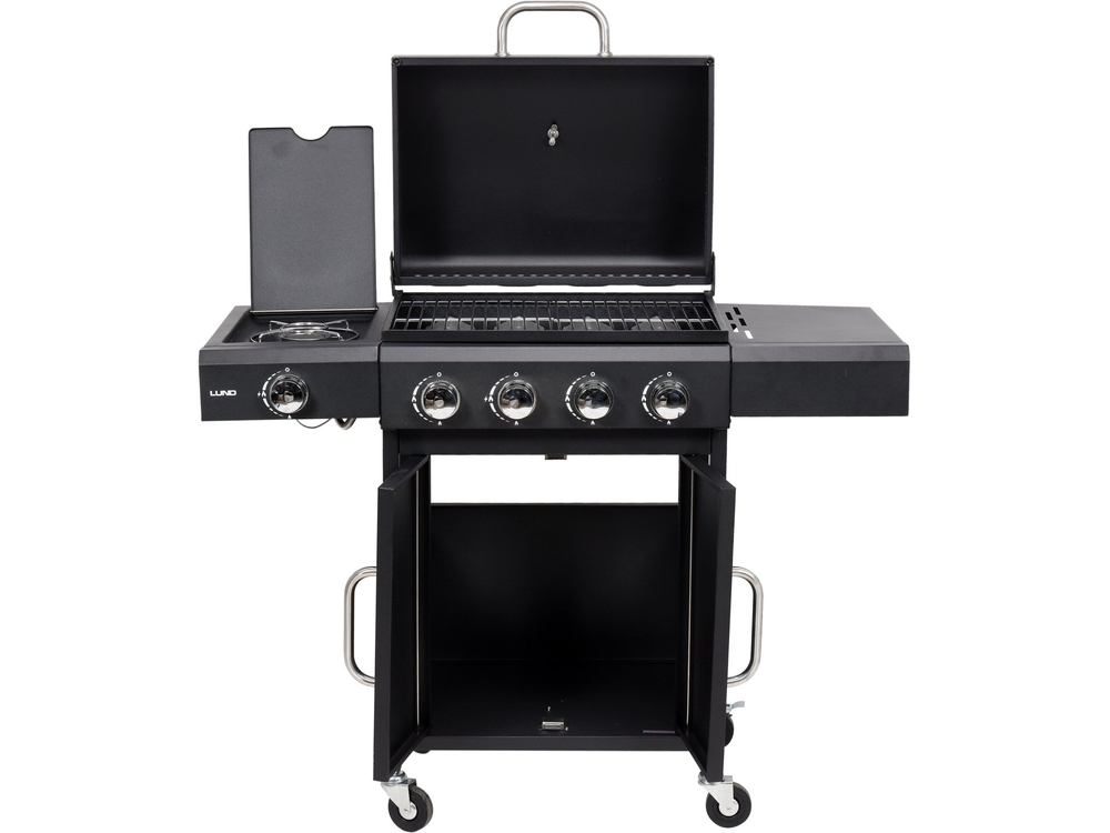4+1 gāzes grils, kas aprīkots ar biezu, hromētu režģi. Sānu plaukti un ietilpīgs, aizslēdzams skapītis ļaus ērti uzglabāt garšvielas un nepieciešamos piederumus. Sānu deglis ar 3,2 kW jaudu ļaus pagatavot un uzsildīt ēdienu katlā vai pannā.