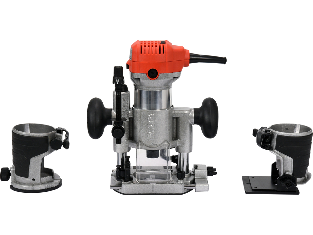 710 W malu frēzēšanas iekārta laminātiem + vadotnes, 6 mm un 8 mm frēzēm. 710 W frēzēšanas iekārta tiek izmantota koka un koksnes materiālu apstrādei ar urbumiem. Frēzēšanas ierīces aprīkošana ar vadotņu sliedēm atvieglo taisnu un līkumainu frēzēšanu.