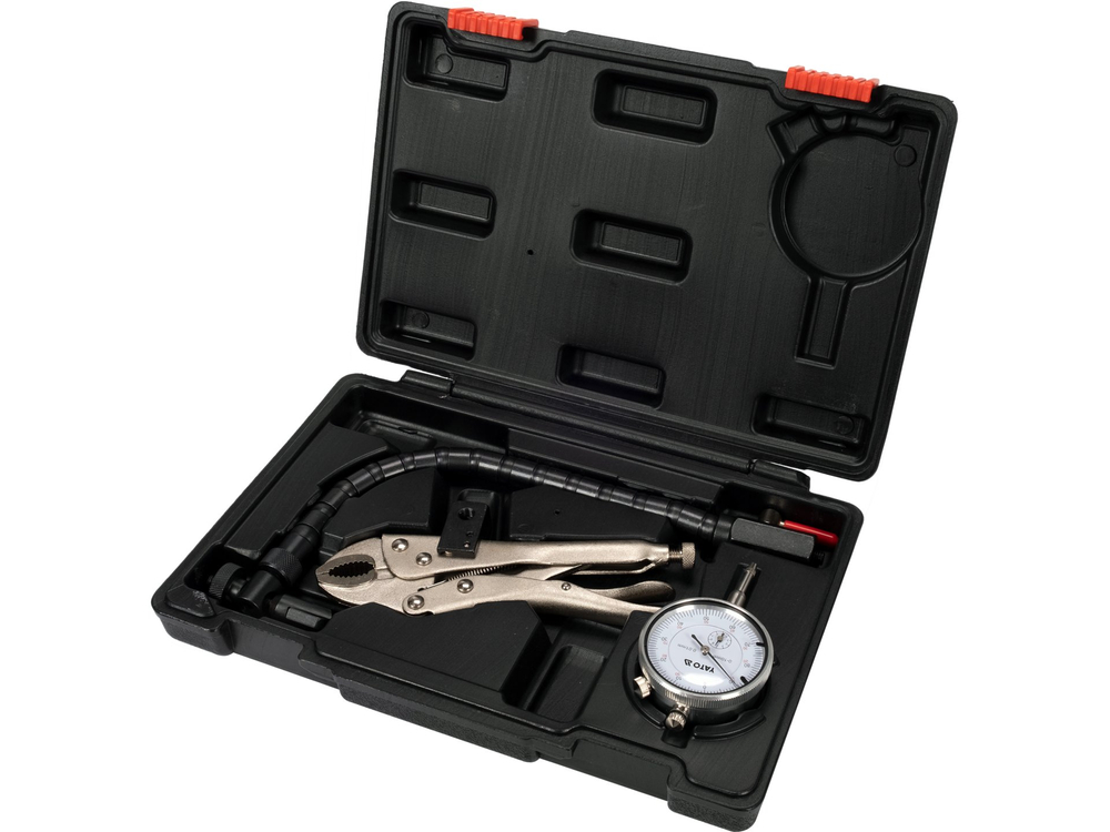 Bremžu diska izslīdēšanas pārbaudes komplekts: ciparnīcas indikators ar precizitāti līdz 0,01 mm, diapazons 10 mm, lokana roka ar skrūves fiksatoru, montāžas skava.