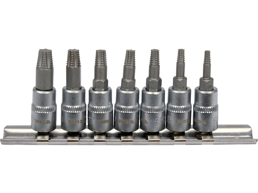 Uzgaļu komplekts ar spirāles formu bojātu torx skrūvju atskrūvēšanai. Muciņas ir novietotas uz sliedes.