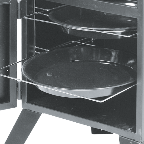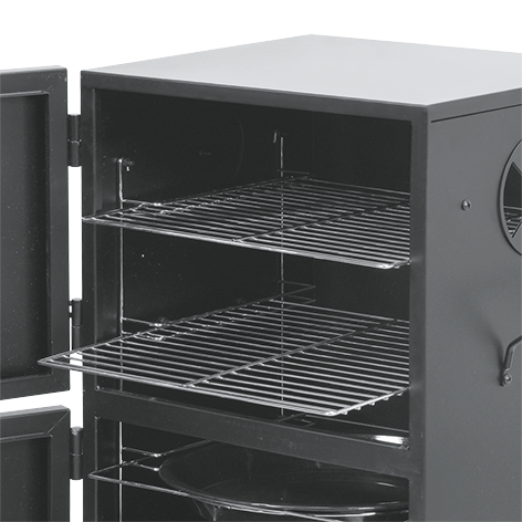 - 2 atsevišķas durvis ar rokturiem nodrošina vieglu piekļuvi ugunij un kūpināšanas līmenim un to kontroli