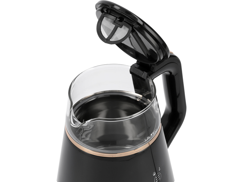 Elektriskā tējkanna ar temperatūras iestatījumu, siltuma saglabāšanas un atmiņas funkciju. Pateicoties dubultajām sieniņām, tējkanna nesakarst no ārpuses. Iekšējā siena ir izgatavota no borosilikāta stikla. Papildu drošības funkcijas, piemēram, automātiskā izslēgšanās un aizsardzība pret pārkaršanu, palielina drošību. Tējkannas vāks atveras divās pakāpēs - pirmajā pakāpē, lai novērstu tvaiku atvēršanas brīdī, otrajā pakāpē var ieliet ūdeni un notīrīt. Noņemams sieta filtrs nodrošina ūdens tīrību. Tējkanna ir aprīkota ar LED apgaismojumu un digitālo vadības paneli.